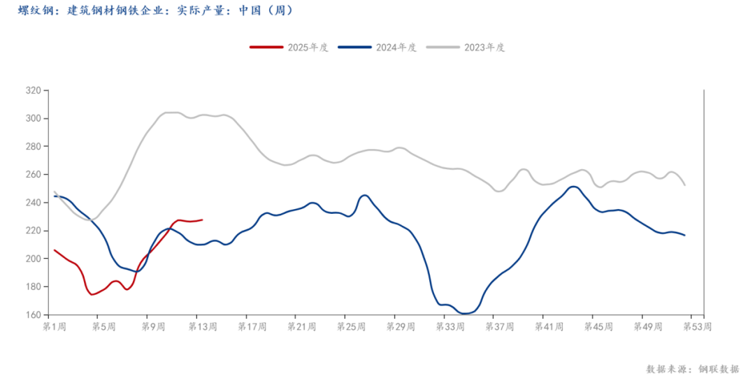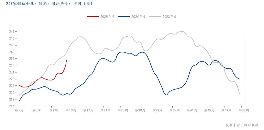 如圖所示,我網(wǎng)對47港口庫存進(jìn)行調(diào)研,本期47港口鐵礦庫存周環(huán)比小幅增加,且?guī)齑嫠教幱谙鄬Ω呶?。從需求端看,鐵水產(chǎn)量亦呈現(xiàn)增勢,截止發(fā)稿,全國247家樣本鋼廠的日均鐵水產(chǎn)量為237.28萬噸,環(huán)比上周增加1.02萬噸,鋼廠仍處于增產(chǎn)階段。數(shù)據(jù)表明,鐵水產(chǎn)量自2025年2月底以來持續(xù)呈現(xiàn)回升態(tài)勢,且增速顯著加快,而當(dāng)前鐵水產(chǎn)量處于加速復(fù)蘇通道,全國鐵水日均產(chǎn)量同比增幅顯著,且鋼廠盈利率與高爐開工率同步改善。短期內(nèi),需求回暖與利潤修復(fù)仍是核心驅(qū)動,而隨著成材端社會庫存逐步去化,預(yù)計短期內(nèi)鐵水產(chǎn)量或維持增勢,但整體產(chǎn)量增幅或有所放緩。